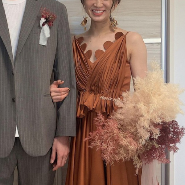 落ち着きがありつつもおしゃれで可愛いカラードレス!ドライフラワーとの相性が抜群で、写真映えします★ドレスはレンタルでいいかな~と思っていたのですが、可愛すぎて購入(笑)前撮りでも後撮りでも大活躍でした!