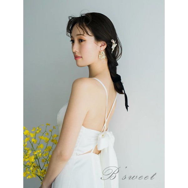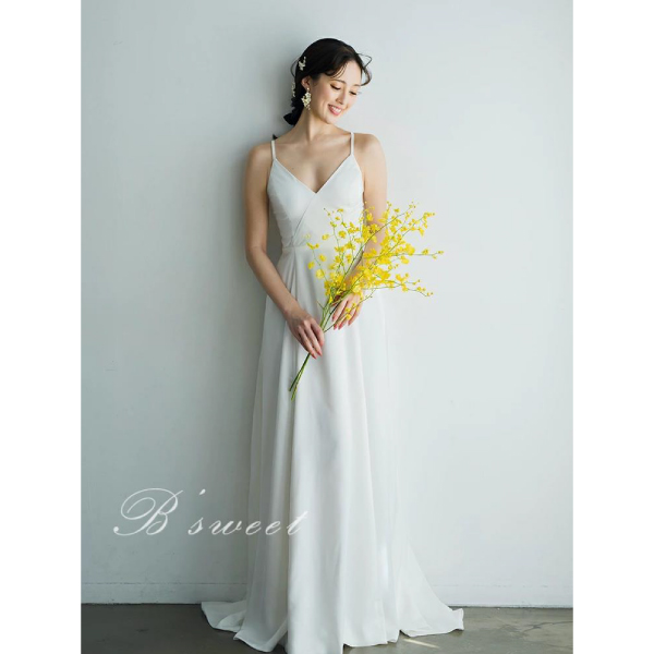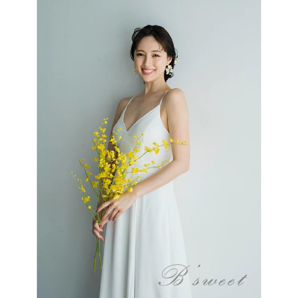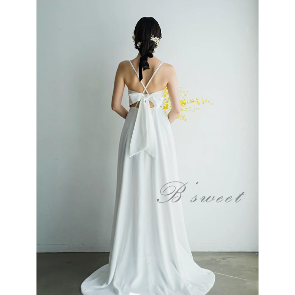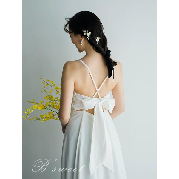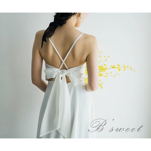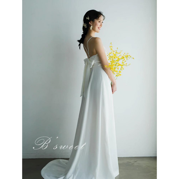 シンプルでありながらも洗練を感じさせるキャミソールドレス。アクセサリーやヘアスタイル、ボレロやショールなどとのコーディネートによって、個性豊かなスタイリングが楽しめます。ホワイトカラーのこのドレスは、ウェディングやパーティー、ちょっとしたお呼ばれなど、多様なシーンで輝きを放つことでしょう。特に背中に施されたリボンが、ドレスの後ろ姿を際立たせ、アクセントとなっています。リボンのデザインは、装いに愛らしさと独自の魅力を加え、着る人の個性を一層引き立てます。洗練されたホワイトカラーが、清潔感と上品さを演出し、特別な日にふさわしい華やかな印象をもたらします。背中のリボンがドレスに遊び心と魅力を添え、周囲の注目を一身に集めることでしょう。