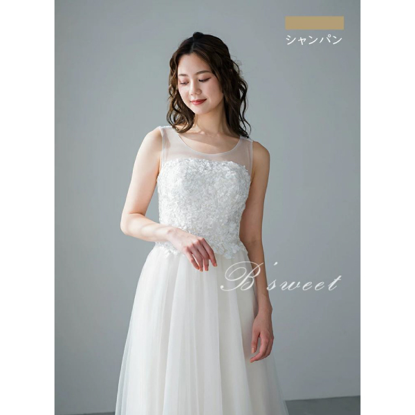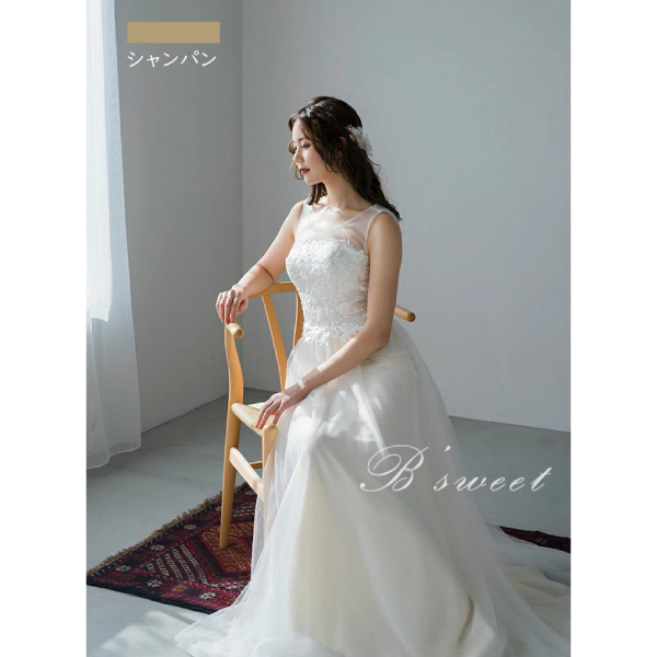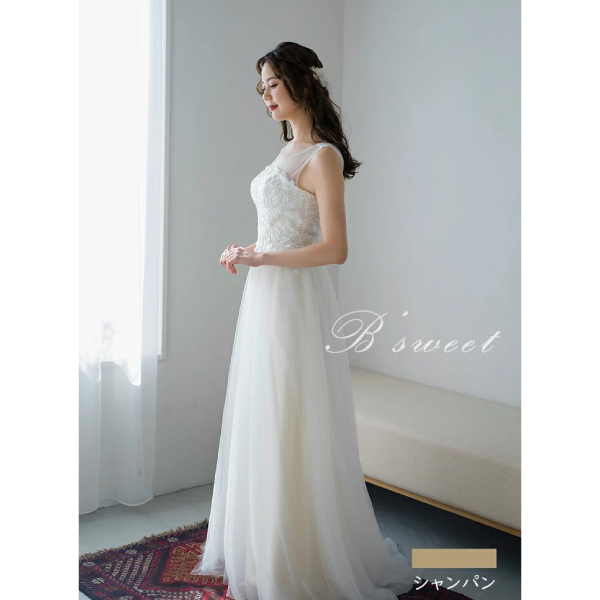 ウエスト下までの編み上げタイプのドレスは、バストとウエストの調節が可能で、自分に合ったフィット感を楽しめます。シースルーのラウンドネックがビスチェのような印象を醸し出し、動いても安心して着用できます。さらに、ドレスの生地にはホワイトのチュール(3層)が柔らかく重なり、愛らしい雰囲気を演出しています。柔らかなトーンの上品なシャンパンカラーです。