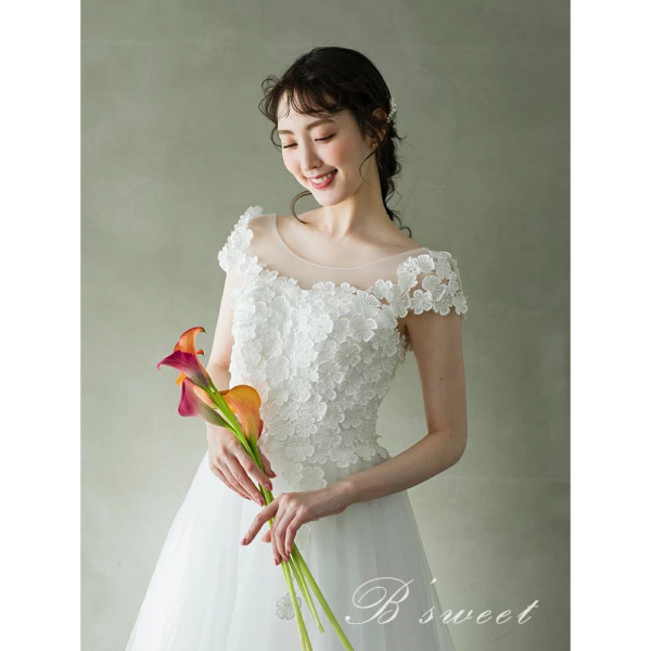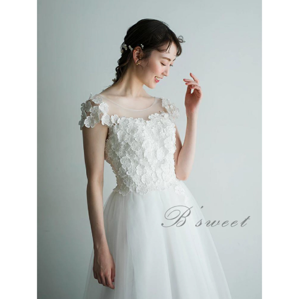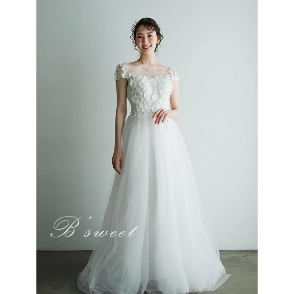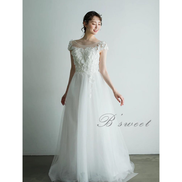 立体的な花の刺繍と広がるAラインに広がるチュール素材が魅力的なドレス。Aラインのシルエットは体のラインを美しく強調し、女性らしい曲線美を際立たせつつ、自然な広がりを持っています。また、上半身に施された大きな花の刺繍で可愛らしくも上品な雰囲気に。シンプルながらも力強い存在感のあるホワイトカラーです。