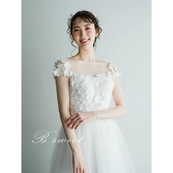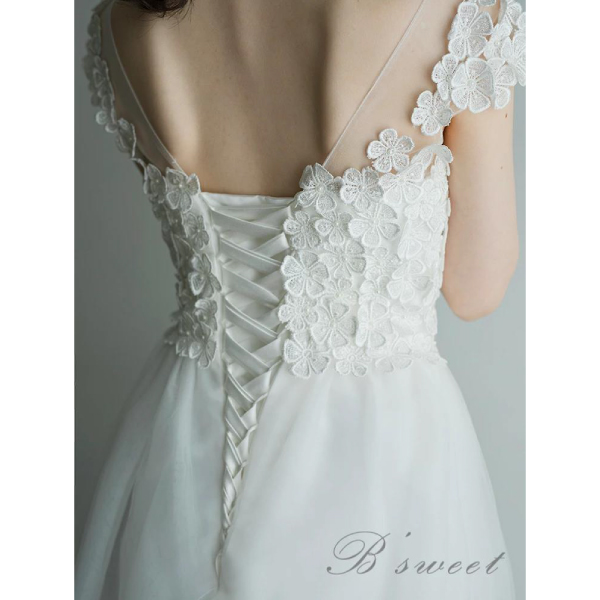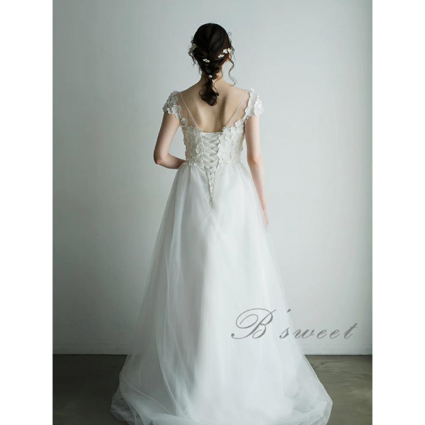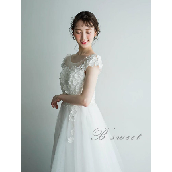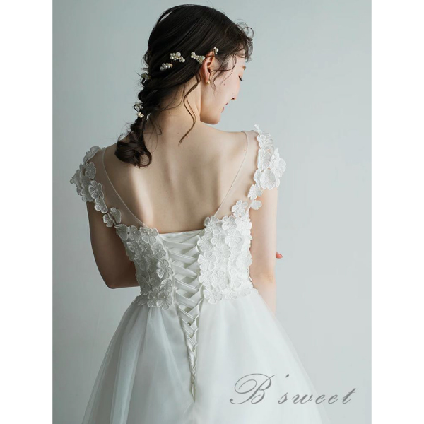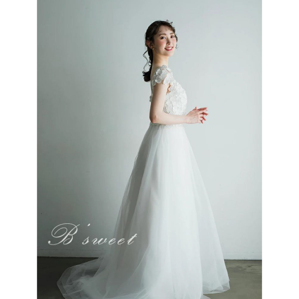 さらに、Aラインのシルエットがドレスに動きを与え、歩くたびに広がるチュール素材が風になびいて優雅な印象を与えます。この絶妙なバランスが、ドレス全体の魅力を高めています。シンプルなホワイトカラーは、清潔感と清涼感をもたらし、特別な場面で輝く装いを演出します。