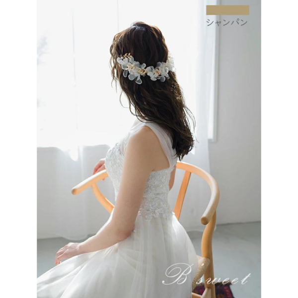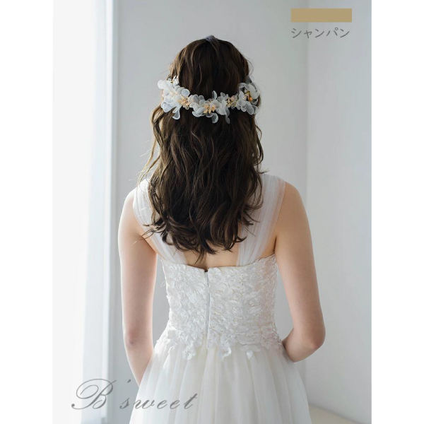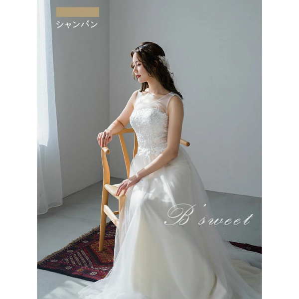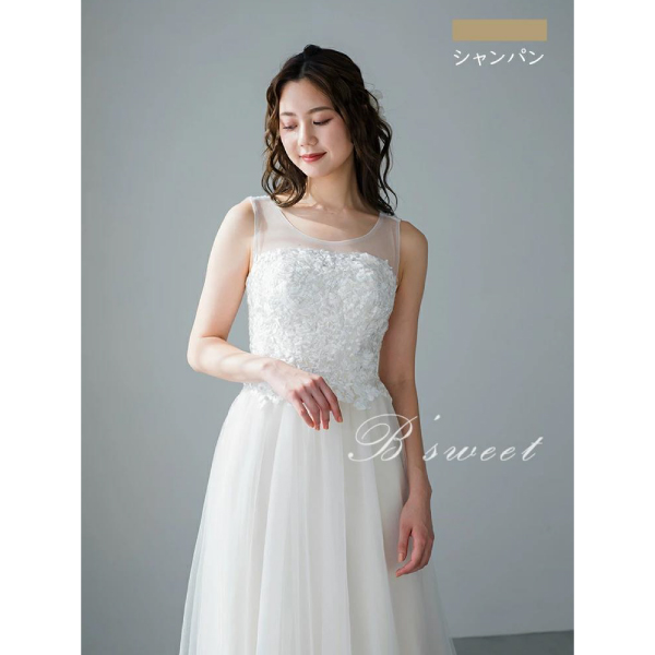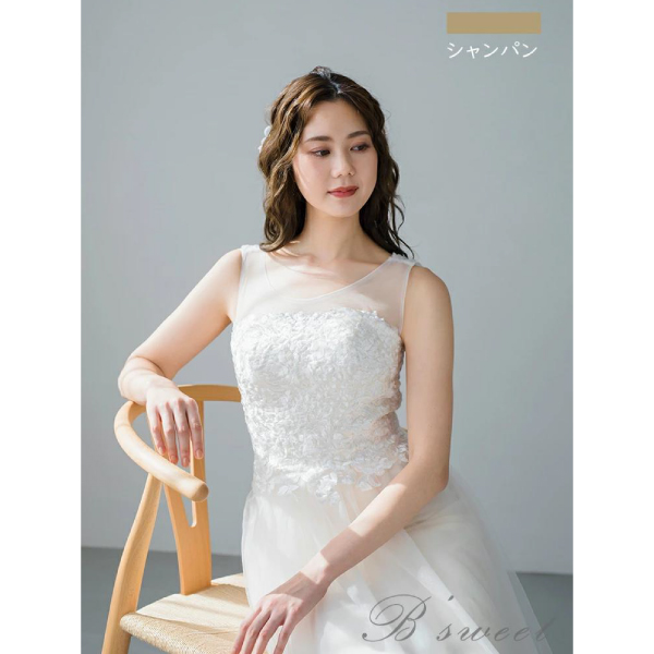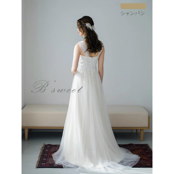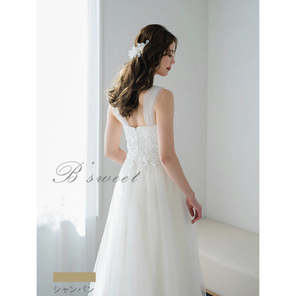 Aラインのシルエットは体のラインを美しく強調し、女性らしい柔らかな曲線美を引き立てます。チュール素材のふんわりとした質感が、動くたびに優雅に揺れ、歩くたびに軽やかな流れを感じさせます。この軽快な動きが、ドレスに活気と華やかさをもたらしています。また、Aラインの自然な広がりが、着る人の歩行や動きをより美しく魅せる効果があります。柔らかなトーンで、ロマンティックなムードを醸し出す上品なシャンパンカラーです。