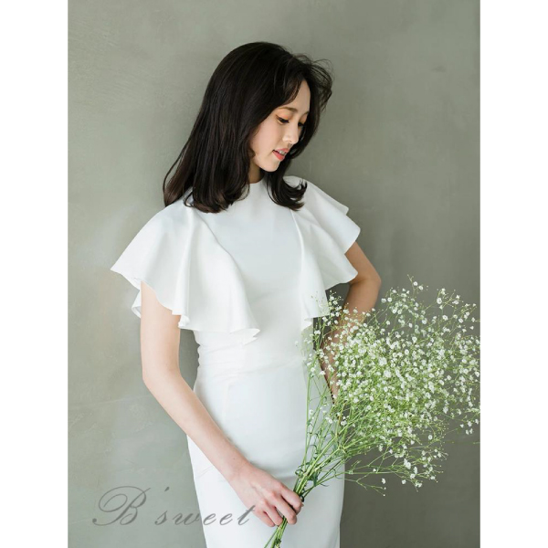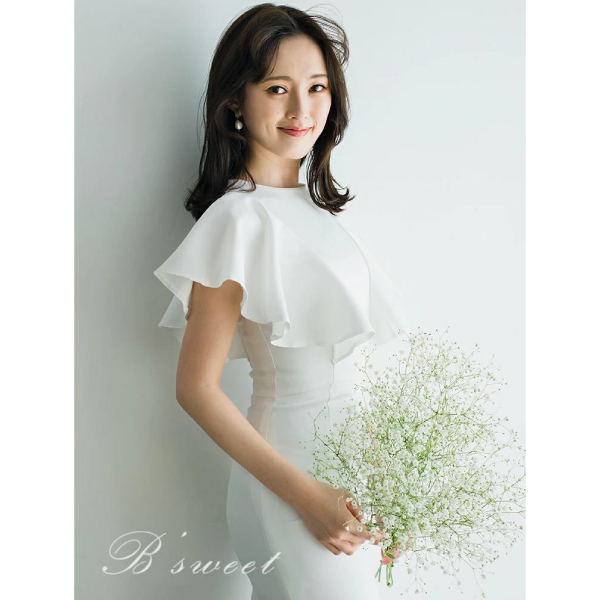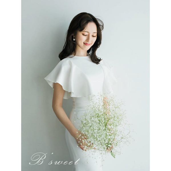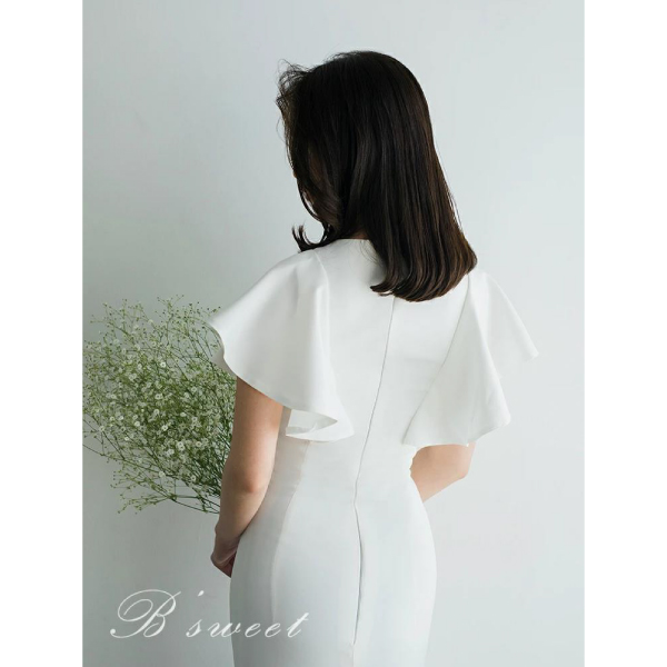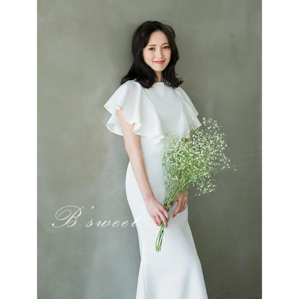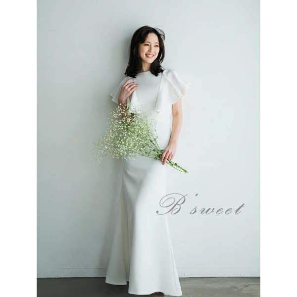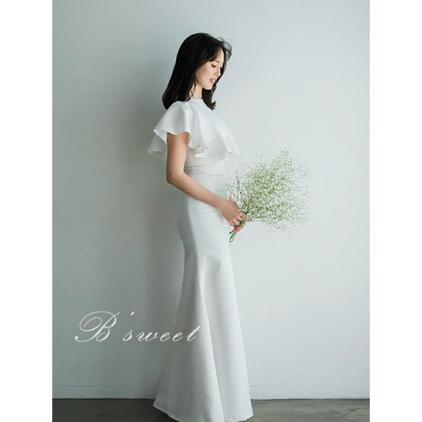 シンプルなマーメイドラインがドレス全体のバランスを美しく整えつつ、女性らしい曲線美を際立たせています。ウエストから広がるシルエットが、体のラインを美しく包み込みながら自然な流れを感じさせ、歩くたびに優雅に揺れます。このシルエットが、着る人の優雅さと品のある雰囲気を一体として引き立てます。