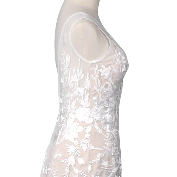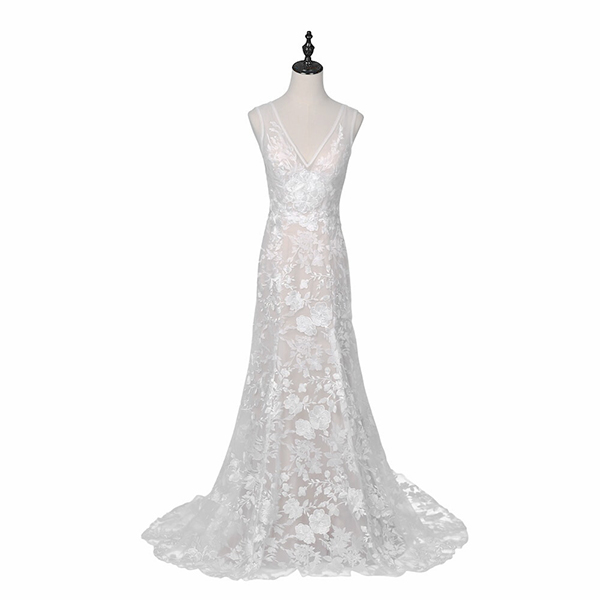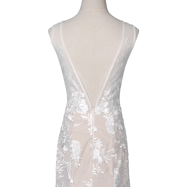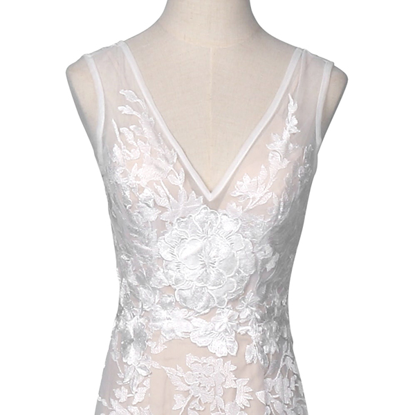 スレンダーラインのナチュラルカラードレスです♪繊細な刺繍デザインがとっても素敵で、大きめのフラワーレースがさらにエレガントさをひきだします。マーメイドラインはクラシカルな雰囲気も上品な印象もどちらも叶えられるのが特徴です♪袖のないノースリーブは「大人っぽく」はもちろん、気になりがちな二の腕や肩のラインを美しく魅せる効果も抜群です!