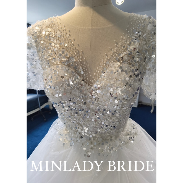 胸元の小花とビーズがキラキラしていておしゃれな韓国風ウェディングドレスです。