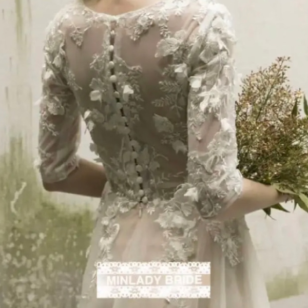 淡いシャンパンカラーの生地と、バックのくるみボタンがヴィンテージライクな雰囲気を演出してくれます。