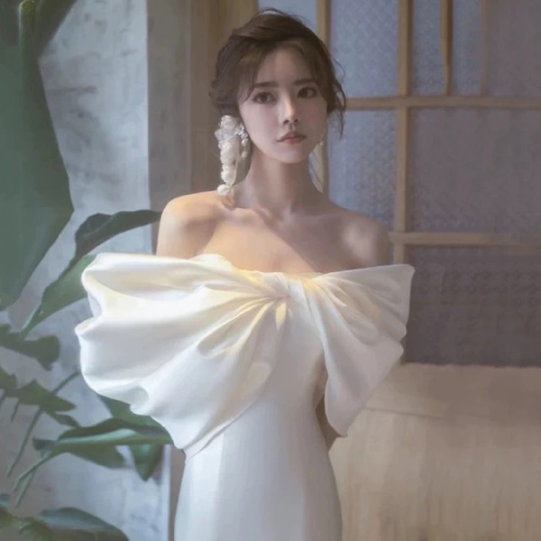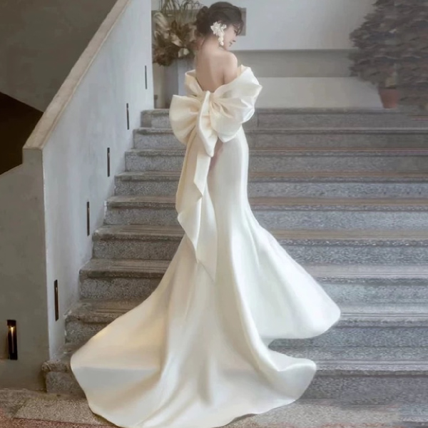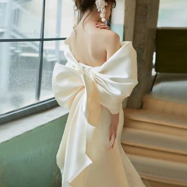 オフショルダーでエレガントな美しさ。大きなリボンが可愛らしさを演出しつつも、サテン素材が上品な印象に仕上げてくれます。