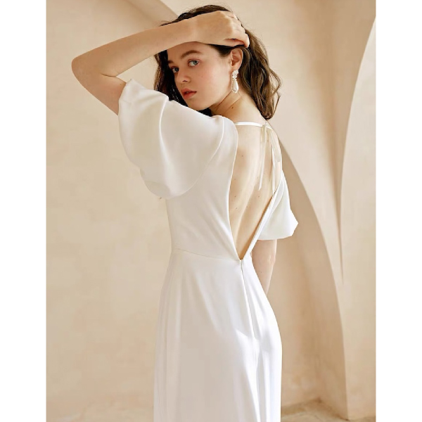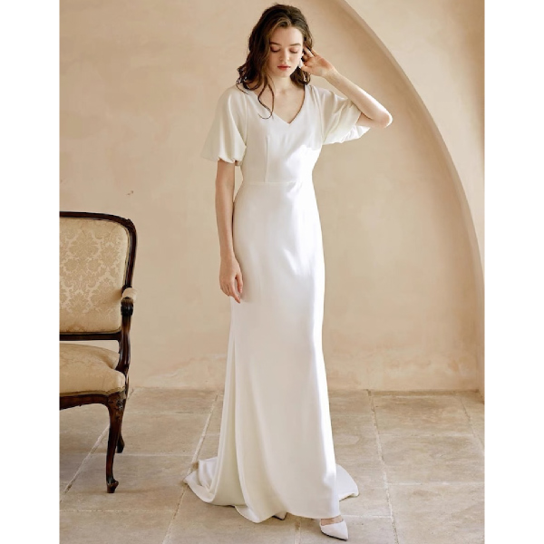 結婚式をコロナで延期することになりセルフ前撮りをすることになり購入しました。海辺での撮影だったのでシンプルな物を探していました。こちらのドレスはウエスト部分で切り返しがあり、ショルダー部分も広がっているのでスタイルが良く見えたので良かったです。