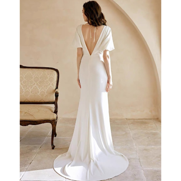 実家の庭が広いので、結婚式に来れなかったおばあちゃんと一緒に後撮りをしたいと思って探していました。ボリュームがなくてストンと落ちるため、ワンピースの延長のようなイメージです。前から見ると露出が少ないものの、背中がしっかり空いているので、女性らしくもなるので、ナチュラルで上品なイメージのドレスをお探しの方にはお勧めです。