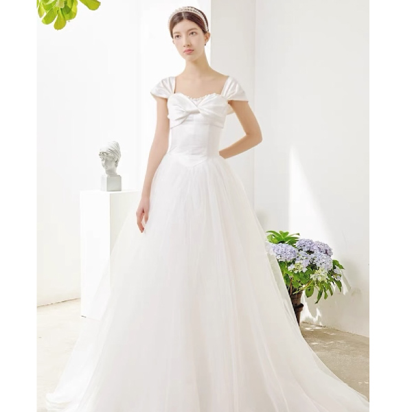 ドレスは式場で買うかレンタルしなきゃ!と思っていたのですが、PIARYさんでお得におしゃれなドレスが買えることを知って即決しました。このドレスは胸元のリボン風デザインが可愛くて購入しましたが、チュール素材のスカートもお気に入りです。