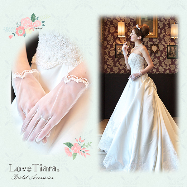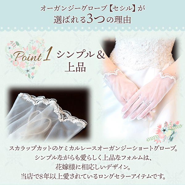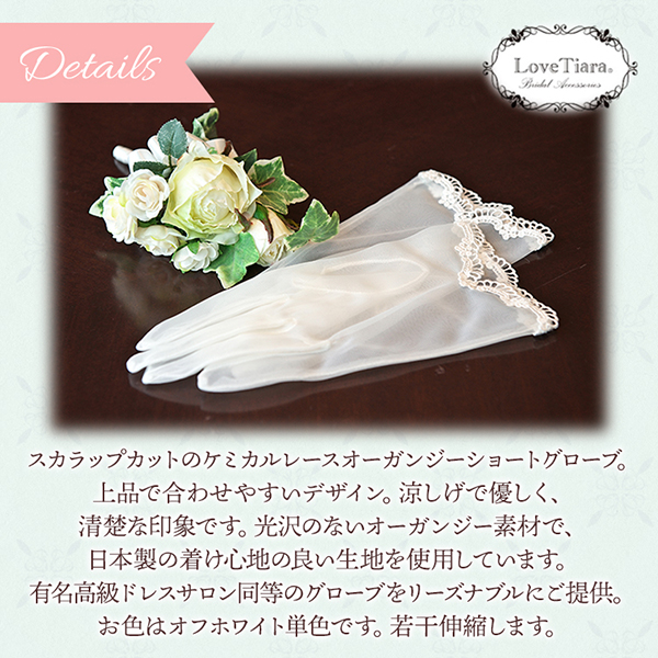 スカラップカットのケミカルレースオーガンジーグローブ。シンプルながらも愛らしく上品なフォルムは花嫁さまに相応しいデザイン。