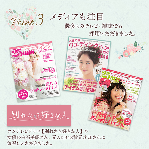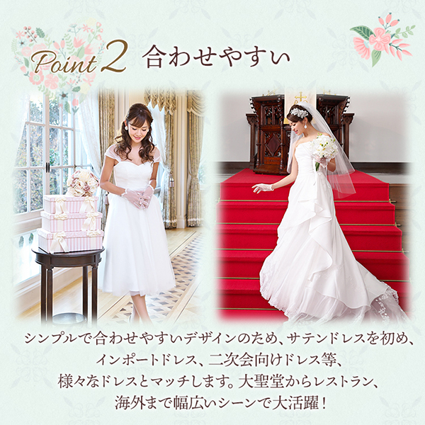 シンプルで合わせやすいデザインのため、サテンドレス、インポートドレス、二次会向けドレス等、様々なドレスとマッチします。大聖堂からレストラン、海外まで幅広いシーンで大活躍!