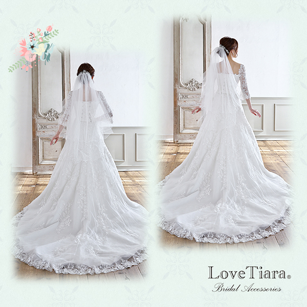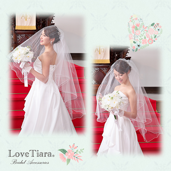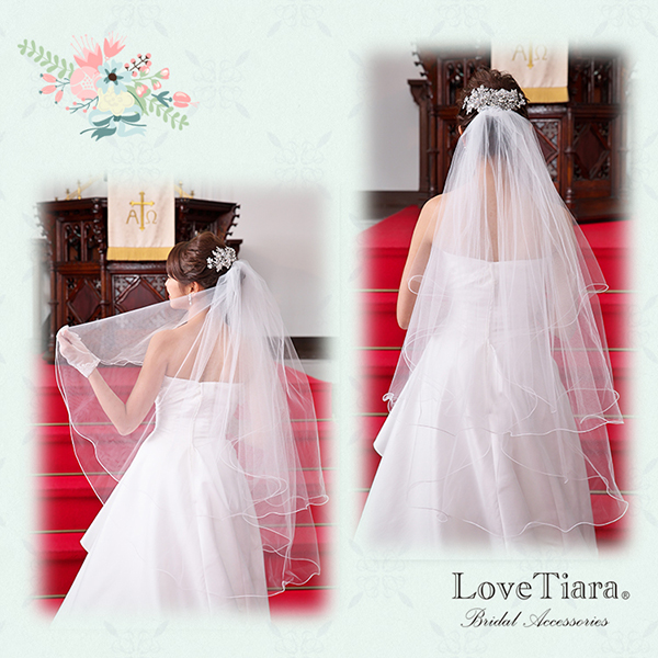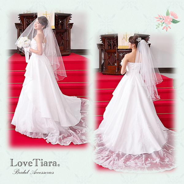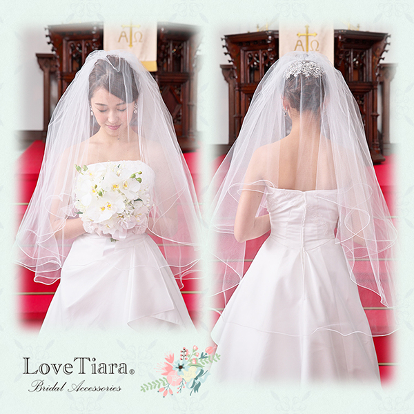 低めに着用しても十分胸元まで来る丈、(ベールの長さ前80cm、後ろ100cm)で発売以来たくさんの花嫁さまにご支持いただいています。