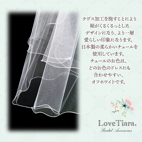 裾がくるくるっとしたデザインで、より一層愛らしい印象になります。日本製の柔らかいチュールを使用し、色はどんなドレスにも合わせやすいオフホワイトです。