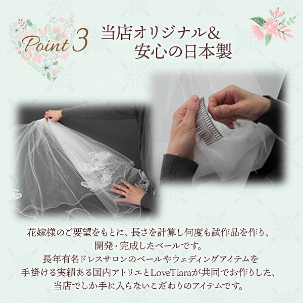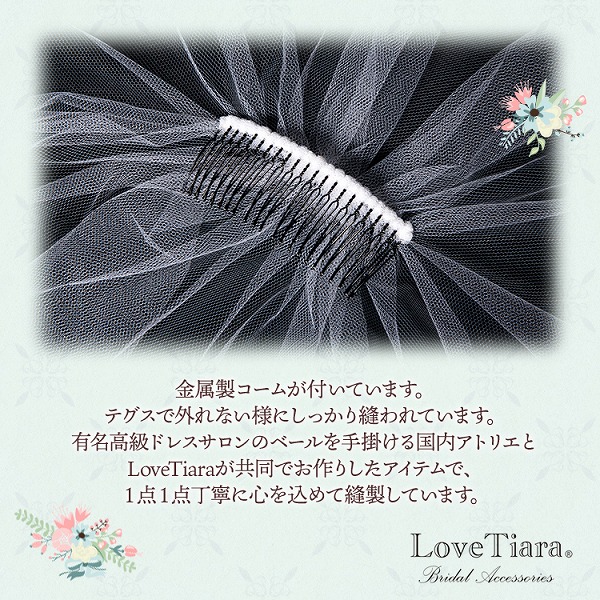 低めシニョンでも胸元に来る長さミディアムベール【メロウパール&ビーズ】トレンドの低めシニョンヘアに合う長さ。ベールの着用位置も低めにすると、一般的なベールでは前の裾が顎辺りに来てしまうことがございます。 そんな花嫁様のお声を元に商品化したベールです。低めに着用しても十分胸元まで来る丈 (ベールの長さ80cm、後ろ100cm) で、発売以来たくさんの花嫁様にご支持いただいています。ふんわりとした裾の愛らしさに パール・ヨーロッパ製高級ビーズをプラス裾がくるくるっとしたデザインで、より一層愛らしい印象になります。また、パールとヨーロッパ製高級ビーズが全体に散りばめられ、ベールアップの際にアクセントになります。日本製の柔らかいチュールを使用し、お色はどのお色のドレスにも合わせやすいオフホワイトです。オリジナル&安心の日本製花嫁様のご要望をもとに、 長さを計算し何度も試作品を作り、開発・完成したベールです。長年有名ドレスサロンのベールやウェディングアイテムを手掛ける実績ある国内アトリエと共同でお作りした、こだわりのアイテムです。永遠の花嫁定番ウェディングベール・装飾のないミディアム (ミドル)のメロウタイプにパールとヨーロッパ製高級ビーズの刺繍が施されています。ベールの長さが前80cm、 後ろ100cmあり、トレンドの低めシニョンの上にベールを着けてベールダウンしても、前の長さが胸元に来る長さとなっています。テグス加工を施すことにより裾がくるくるっとしたデザインになり、より一層愛らしい印象になります。日本製の柔らかいチュールを使用しています。チュールのお色は、どのお色のドレスにも合わせやすい、オフホワイトです。パールとヨーロッパ製高級ビーズが全体に刺繍されていることによりより愛らしい印象と与え、動くたびにビーズが上品に輝きます。金属製コームが付いています。テグスで外れない様にしっかり縫われています。有名高級ドレスサロンのベールを手掛ける国内アトリエと共同でお作りしたアイテムで、1点1点丁寧に心を込めて縫製しています。