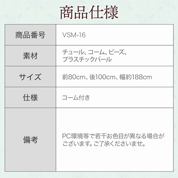 | 材質 | チュール、コーム、 ビーズ 、 プラスチックパール |