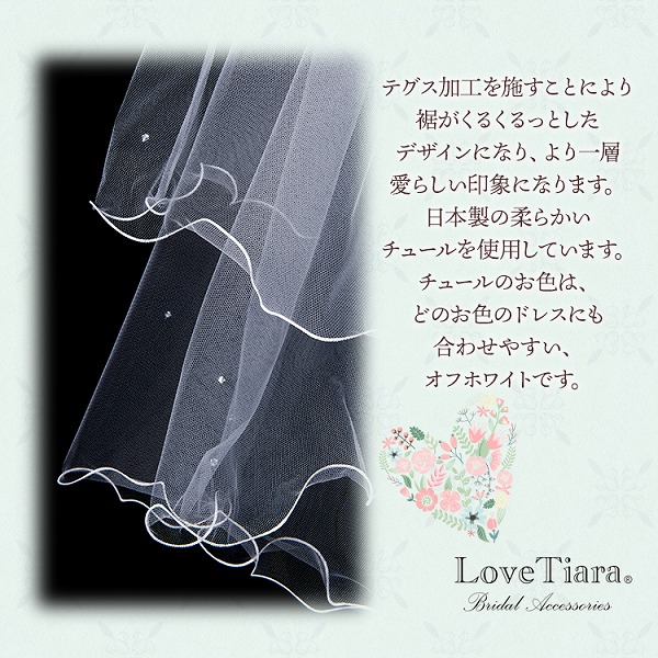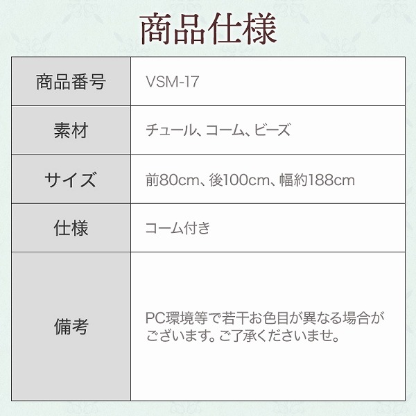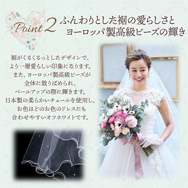 低めシニョンでも胸元に来る長さミディアムベール【メロウパール&ビーズ】トレンドの低めシニョンヘアに合う長さ。ベールの着用位置も低めにすると、一般的なベールでは前の裾が顎辺りに来てしまうことがございます。 そんな花嫁様のお声を元に商品化したベールです。低めに着用しても十分胸元まで来る丈 (ベールの長さ80cm、後ろ100cm) で、発売以来たくさんの花嫁様にご支持いただいています。ふんわりとした裾の愛らしさに パール・ヨーロッパ製高級ビーズをプラス裾がくるくるっとしたデザインで、より一層愛らしい印象になります。また、パールとヨーロッパ製高級ビーズが全体に散りばめられ、ベールアップの際にアクセントになります。日本製の柔らかいチュールを使用し、お色はどのお色のドレスにも合わせやすいオフホワイトです。オリジナル&安心の日本製花嫁様のご要望をもとに、 長さを計算し何度も試作品を作り、開発・完成したベールです。長年有名ドレスサロンのベールやウェディングアイテムを手掛ける実績ある国内アトリエと共同でお作りした、こだわりのアイテムです。永遠の花嫁定番ウェディングベール・装飾のないミディアム (ミドル)のメロウタイプにパールとヨーロッパ製高級ビーズの刺繍が施されています。 ベールの長さが前80cm、 後ろ100cmあり、トレンドの低めシニョンの上にベールを着けてベールダウンしても、前の長さが胸元に来る長さとなっています。テグス加工を施すことにより裾がくるくるっとしたデザインになり、より一層愛らしい印象になります。日本製の柔らかいチュールを使用しています。チュールのお色は、どのお色のドレスにも合わせやすい、オフホワイトです。パールとヨーロッパ製高級ビーズが全体に刺繍されていることによりより愛らしい印象と与え、動くたびにビーズが上品に輝きます。金属製コームが付いています。テグスで外れない様にしっかり縫われています。有名高級ドレスサロンのベールを手掛ける国内アトリエと共同でお作りしたアイテムで、1点1点丁寧に心を込めて縫製しています。