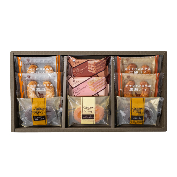 | 内容 | 馬蹄パイ(キャラメル・シュガーバター)・スフレ濃厚ショコラ×各2個、ミルフイユ(キャラメルラテ・フランボワーズ)・スフレ芳醇フロマージュ×各1個 |