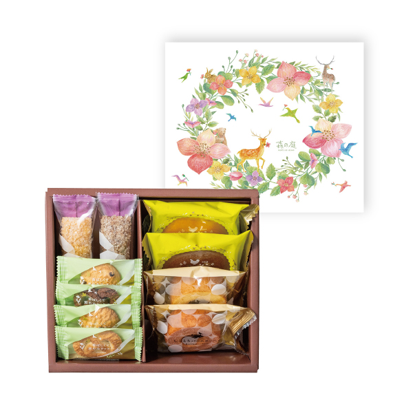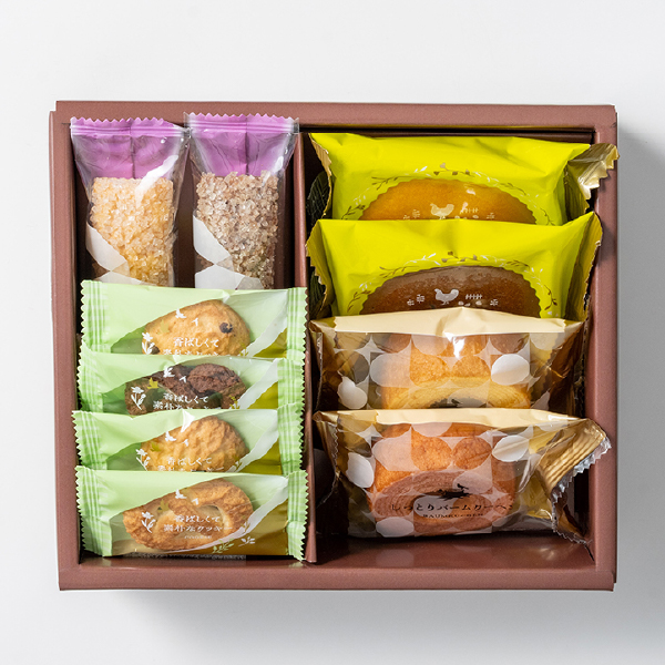 | 内容 | しっとりバームクーヘン・しっとりバームクーヘン苺×各1、有精卵たっぷりマドレーヌ(プレーン・ショコラ×各1)、香ばしくて素朴なクッキー(ミルク・ショコラ・メープル・チョコチップ×各1)、さくさくスティックパイ(メープル・ショコラ×各1)