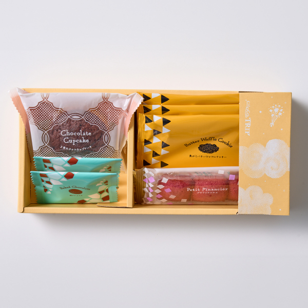 ふんわり2層のチョコカップケーキ、濃厚なチョコレートの風味が特徴の焼きショコラ、焦がしバター香るキャラメリゼされたワッフルクッキー、いろどりプチサイズのフィナンシェ。楽しさ詰まった、魅惑のお菓子たちで、食べあう人に笑顔の時間をプレゼントします。