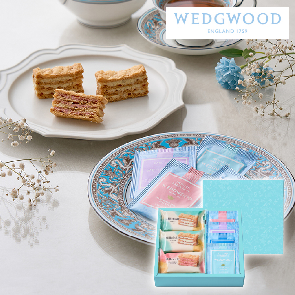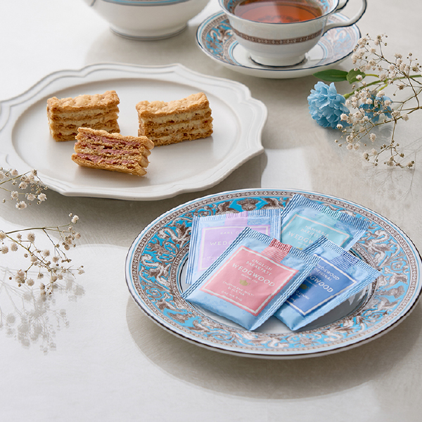 国産小麦100%のパイ生地に、バニラとフランボワーズの2種のクリームをサンドしたミルフイユと、ウェッジウッドの紅茶4種をセットにしました。サクサクのパイと風味豊かなクリーム、そして紅茶の芳醇な香りが口の中に広がる、贅沢なティータイムをお楽しみください。