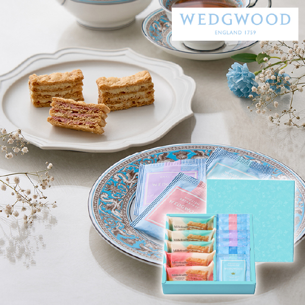国産小麦100%のパイ生地に、バニラとフランボワーズの2種のクリームをサンドしたミルフイユと、ウェッジウッドの紅茶4種をセットにしました。サクサクのパイと風味豊かなクリーム、そして紅茶の芳醇な香りが口の中に広がる、贅沢なティータイムをお楽しみください。