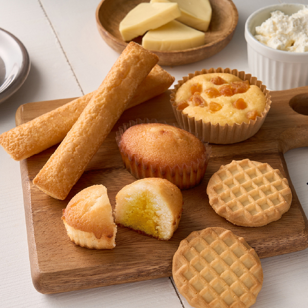 | 内容 | アプリコットチーズフィナンシェ×2個、アプリコットチーズケーキ×1個、チーズスティックケーキ×2個、ワッフルクッキー×2個 |