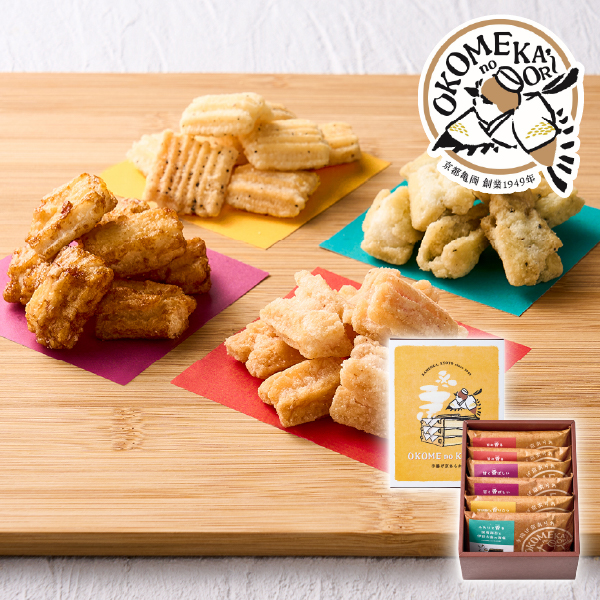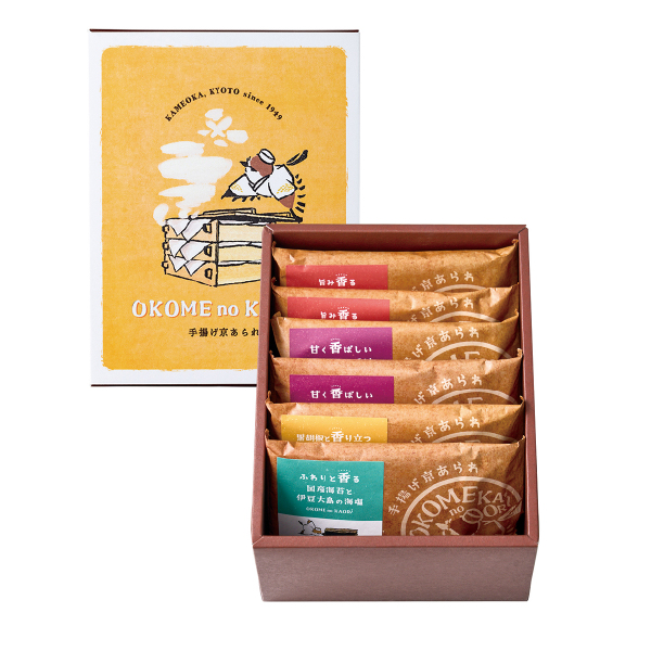 | 内容 | 手揚げ京あられ×6袋(旨み香る干し海老と伊豆大島の海塩14g・甘く香ばしい炊き出し醤油15g×各2袋、ふわりと香る国産海苔と伊豆大島の海塩15g・黒胡椒と香り立つ燻製チーズ12g×各1袋) |