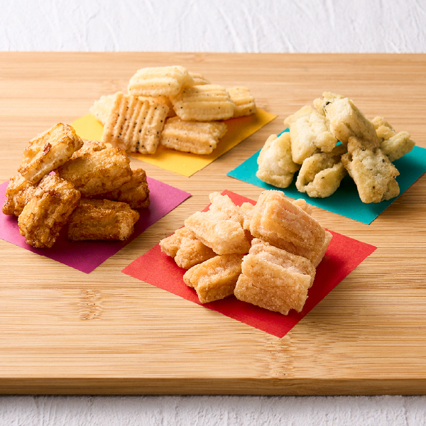 京都亀岡で保津川あられ本舗が昔ながらの製法で作る、お米の香りがする「ほんもの」のあられ。きめが細かく、粘りのある食感が特徴の佐賀県産ヒヨクモチを使用して、健康や美容に良いとされる米油で1つ1つ丁寧に揚げ、香り豊かな4種のフレーバーに仕上げました。京の職人がこだわり続ける、「お米の香りがするあられ」をお楽しみください。