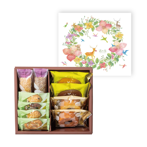 | 内容 | しっとりバームクーヘン・しっとりバームクーヘン苺×各1、有精卵たっぷりマドレーヌ(プレーン・ショコラ×各1)、香ばしくて素朴なクッキー(ミルク・ショコラ・メープル・チョコチップ×各1)、さくさくスティックパイ(メープル・ショコラ×各1)