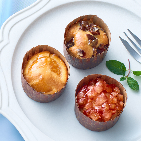 艶っと光るシロップ漬けの果実や、セミドライの果実がジュエリーのようなカップケーキです。空気をたっぷり含ませて焼きあげた、果実入りのなめらかな生地に煌めく果実たちをトッピングして、果実を味わうカップケーキに仕上げました。