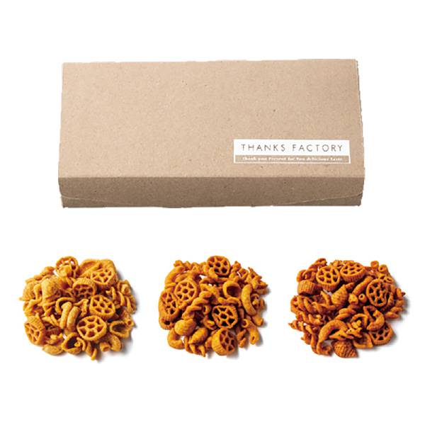 食べ比べて楽しいおつまみセレクション。楽しいひとときをよりいっそう楽しくする個性的な味のおつまみを取り揃えました。見た目も食感も楽しい、さくさくと軽く食べられるパスタは、おやつにはもちろん、お酒のおつまみにもピッタリ!定番の塩味、味わい深いコンソメ味、ちょっぴり大人で珍しいトマトバジル味を詰め合わせました。シンプルなパッケージは老若男女問わず、「美味しい」と「感謝」の気持ちを込めて贈ります。