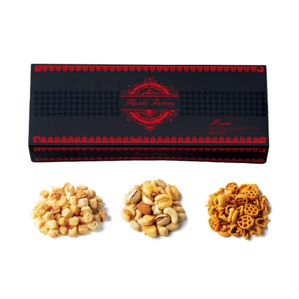 ほんの少しのクセが虜になる深い味わいに。至福の時間を引き立てる、大人のつまみは甘くない。ちょっとつまむのに最適な可愛い形のキューブラスクはシーザー味、気軽に食べられるミックスナッツ、食感が小気味よいサクッとパスタは塩味の3種類をセットにしました。お酒のおつまみにはもちろん、少しだけ大人なおやつに。優雅な時を過ごせるのは大人だけの贅沢。感謝の想いに酔いしれて。