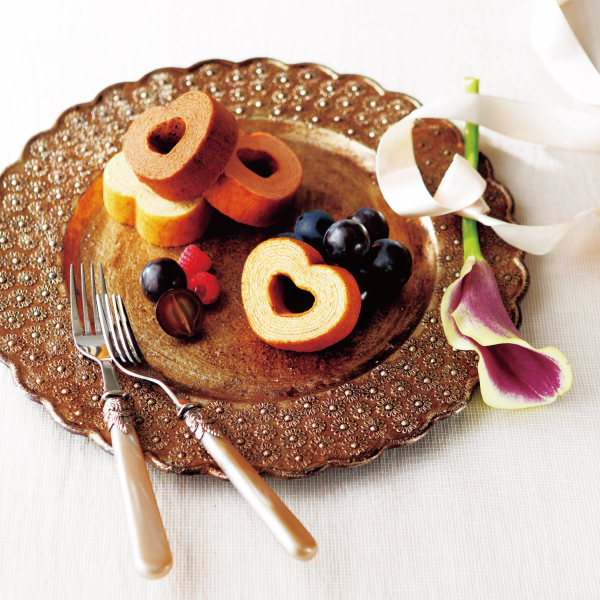 キュートなハートのバームクーヘン。定番人気のバームクーヘンを可愛くハートにしました。バームクーヘンは木の切り株を模したお菓子で、幾重にも重なる年輪と同じ形をしています。そのことから、木が年輪を重ねていくように新郎新婦も末長く共に歳を重ねていけますように、という意味が込められています。メープルシロップやチョコレート、アイシングなどをかけるとより美味しく楽しめます。ゲストの皆様にも愛のおすそわけを。
