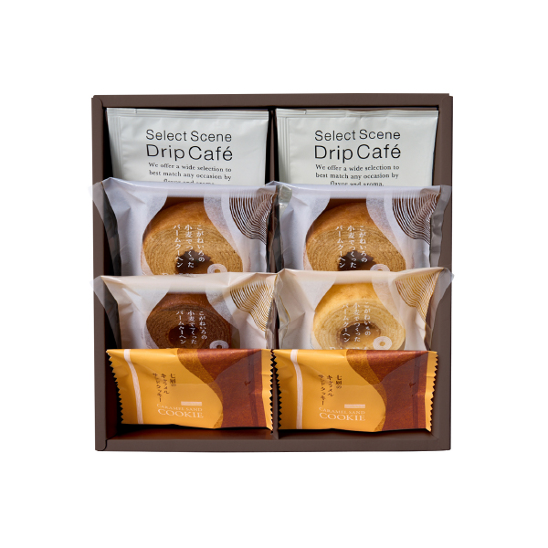 | 内容 | ふんわりバームクーヘン(ミルク・ココア×各1個、黒糖×2個)、七層のキャラメルサンドクッキー×2個、三喜屋珈琲のレギュラーコーヒー×2袋