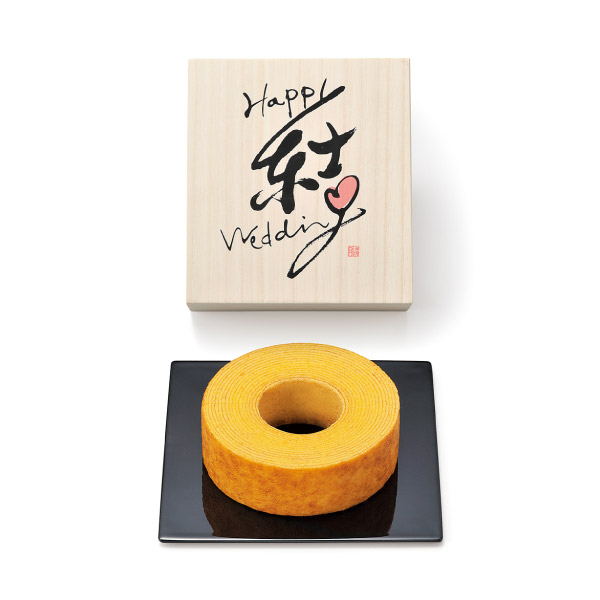 北海道産の生クリームをたっぷりと使用してしっとりとしたおいしさを嬉しい気持ちを込めて。生クリームをたっぷりふくんで、ふんわり・しっとりと焼き上げたバームクーヘンでシンプルな見た目は友人や上司、ご両親にもお勧めできる一品です。上品な木箱に入っているので目上の方への贈り物にも最適。「Happy Wedding」と「結」の文字を可愛らしくハートの糸で結んだパッケージに、幸せなめぐりあわせに感謝の思いを込めて贈ります。