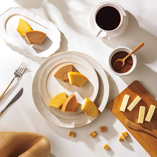 北海道産牛乳の濃厚な旨味が溶け込む優しさあふれるミルク味と、大人を魅了するキャラメルの香りが漂うキャラメル味。2つの味わいが楽しめるカットバウムクーヘンです。ひとつひとつ丁寧に焼き上げた、しっとりふわふわ食感をお楽しみください。