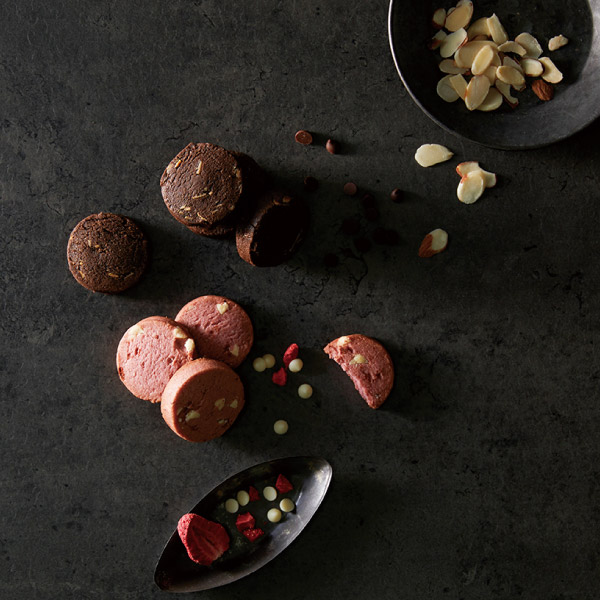 ストロベリーミルク味にはホワイトチョコとドライストロベリーを、ココア味にはアーモンドをたっぷり練り込んでホロホロ食感に焼き上げました。
