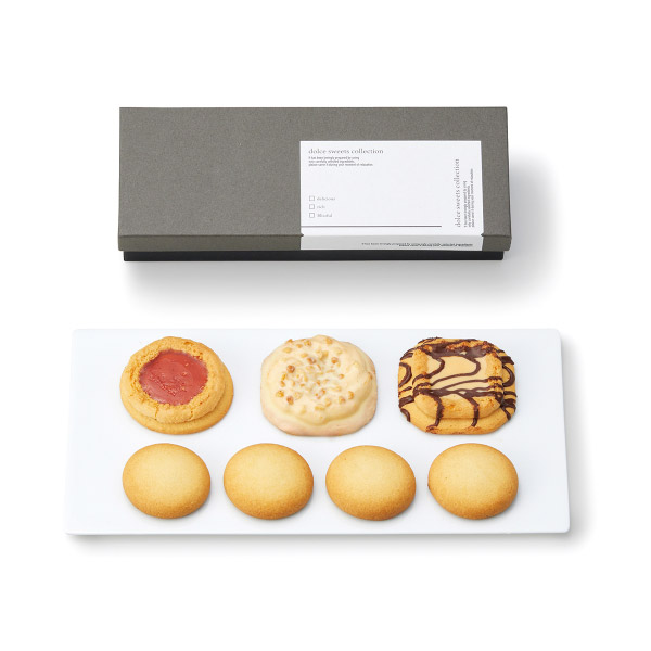 甘く彩られた宝石のようなお菓子のアソートセット。2種類の生地を重ねたクッキーにストロベリージャムやチョコレート、ナッツをトッピングした目にも楽しい華やかなスイーツです。二度焼き製法から生まれるザクザクっとした食感も特徴です。チョコインクッキーはしっとりサクッとしたクッキー生地でチョコレートを包み込んでいます。