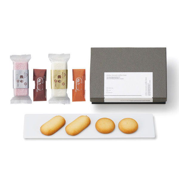 | 内容 | 最中(紅・白)各1個、あんこ(粒あん・こしあん)各1個、ソフトクッキー(カスタード)×2個、チョコインクッキー×2枚 |