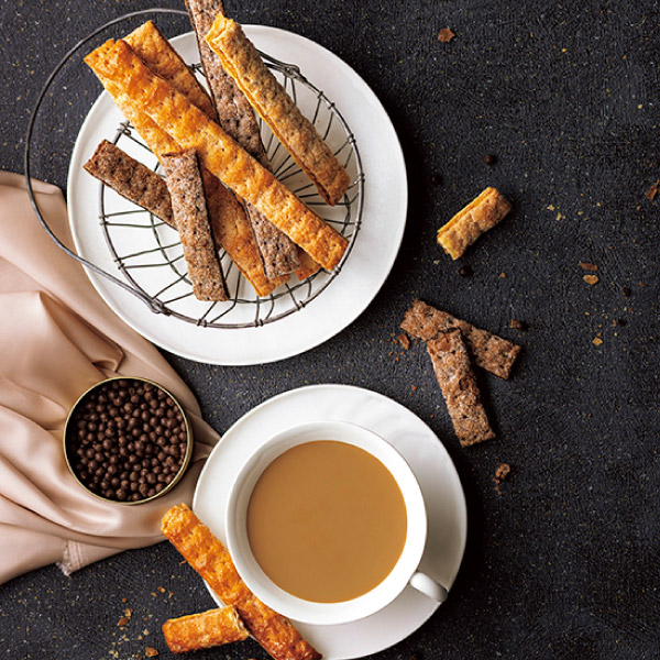 何層にも重なったパイ生地にほろ苦いショコラ生地や甘い香りのキャラメル生地を丁寧に重ね合わせ、香ばしく焼き上げました。サクサクとした軽やかな食感と、上品な甘さと香りが広がる大人のためのスティックパイです。