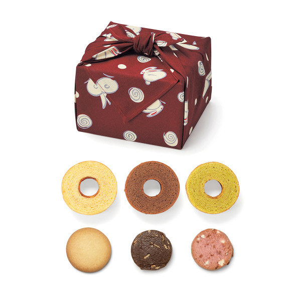 | 内容 | ミニバウム(バニラ・チョコ・抹茶)各1個、チョコインクッキー×1個、クッキー(いちごミルク・ココア)各1個、風呂敷1枚(約46.5×46.5cm) |