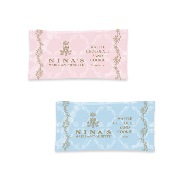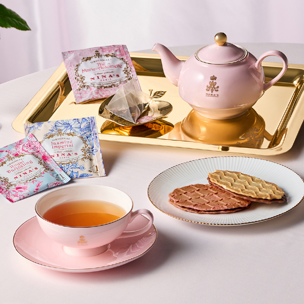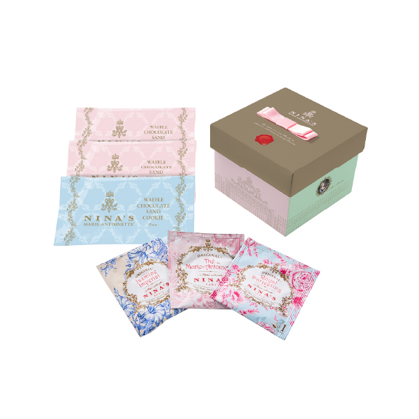 王妃マリー・アントワネットのラグジュアリー・ティーをイメージしたニナスの紅茶と、チョコレートをサンドした香ばしいワッフルクッキーをセットでお届けします。