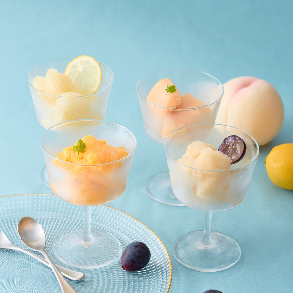 瀬戸内の豊かな気候で育った国産フルーツを使用したジュレを凍らせて食べるシャーベット。まるでフルーツを食べているかのような濃厚な甘みや爽やかな酸味が口いっぱいに広がります。そのままゼリーとして味わえるのも魅力的です。