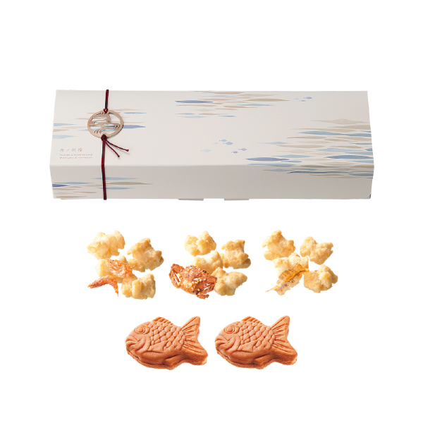 | 内容 | 珍味入りおかき(えび)22g×1、珍味入りおかき(かに)22g×1、珍味入りおかき(ほたて)22g×1、鯛のおまんじゅう×2 |