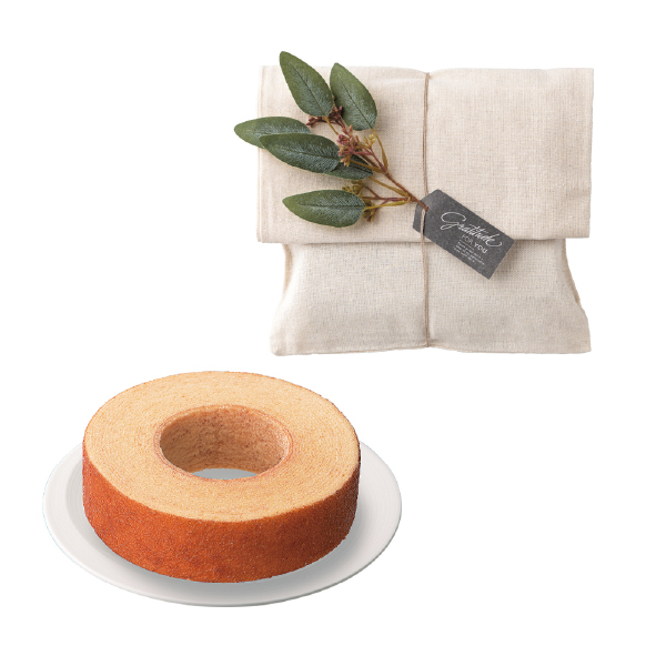 自然からの贈り物を大切な方へ。お洒落なグリーンが添えられた麻風の布袋はまるで自然からの贈り物のように、開ける時のワクワク感が楽しめます。練乳の甘みがとろけるバームクーヘンです。バームクーヘンは木の切り株を模したお菓子で、幾重にも重なる年輪と同じ形をしています。そのことから、木が年輪を重ねていくように新郎新婦も末長くともに歳を重ねていけますように、という意味が込められている王道の引き菓子です。