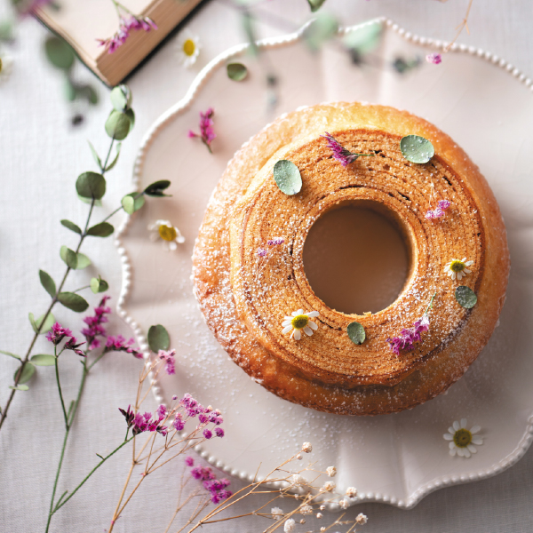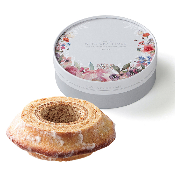 お花たちに囲まれたかのようなパッケージの中には、結婚式のギフトで定番のバームクーヘンを包みました。バームクーヘンは木が年輪を重ねていくように新郎新婦も末長くともに歳を重ねていけますようにという意味が込められています。チョコレートやはちみつ、アイシングなどをかけて楽しむのもおすすめです。ティータイムを贅沢に飾るセレブなスイーツで、甘い香りに包まれた心休まるひとときをお楽しみください。友人やスイーツ好きな方、お母さまなど誰がもらっても嬉しい一品です。