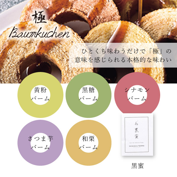 黒蜜をかけて贅沢に味わう、黄粉バーム、黒糖バーム、シナモンバーム、さつま芋バーム、和栗バーム、5つの和を感じるバームクーヘンのセットです。ひとくち味わうだけで、「極」の意味を感じられます。黒蜜が和の素材をより一層引き立て、さらに美味しく召し上がっていただけます。落ち着いたデザインのパッケージで目上の方はもちろん、甘いもの好きな方や和スイーツが好みの方への贈り物にもおすすめです。