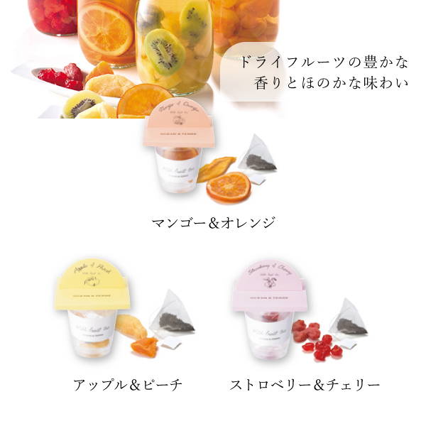 | 内容 | ドライフルーツ(マンゴー・オレンジ)20g×1、(アップル・ピーチ)20g×1(ストロベリー・チェリー)20g×1、三角ティーメッシュ(ダージリン)2g×3 |