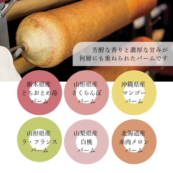 | 内容 | 栃木県産 とちおとめ苺バーム×1、山形県産 さくらんぼバーム×1、山梨県産 白桃バーム×1、沖縄県産 マンゴーバーム×1、山形県産 ラ・フランスバーム×1 |